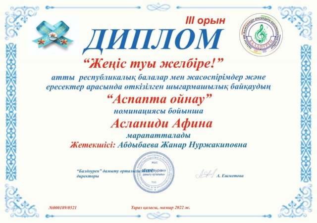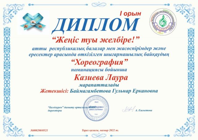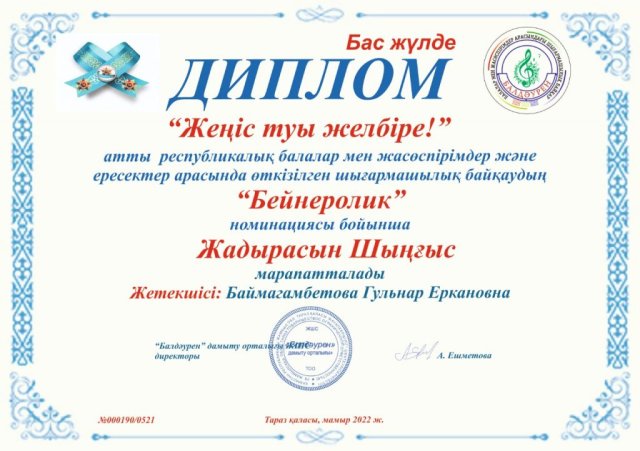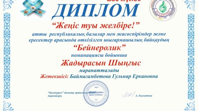 В мае месяце текущего года творческим центром «Балдаурен» был организован Республиканский творческий конкурс в различных номинациях среди детей, подростков и взрослых на тему «Жеңіс туы, желбіре».