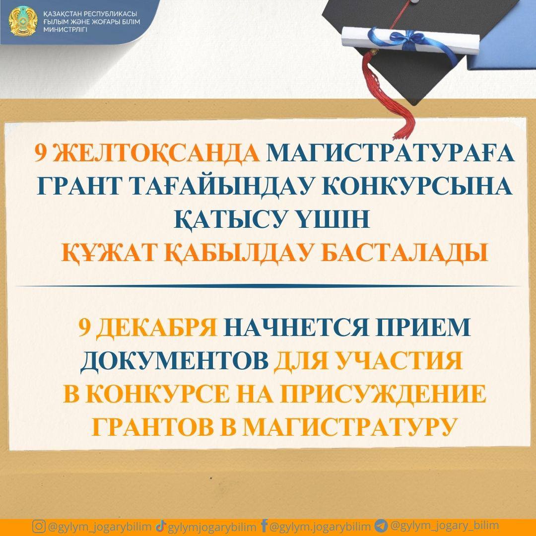 9 желтоқсаннан бастап магистратураға грант тағайындау конкурсына қатысу үшін құжаттар қабылдау басталады! Құжаттарды жоғары оқу орындарының қабылдау комиссиялары (оның ішінде виртуалды комиссиялар) арқылы тапсыруға болады.