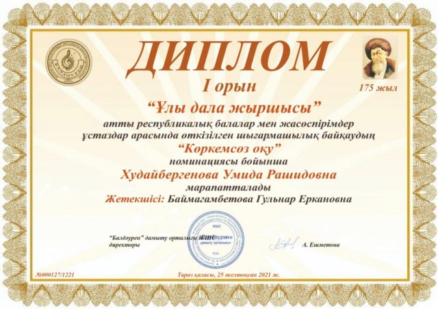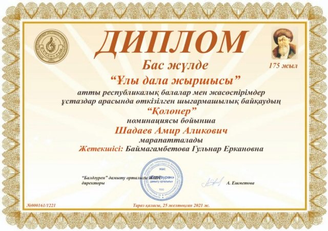 С 1 по 25 декабря текущего года в честь 175-летия Жамбыла Жабаева прошел республиканский онлайн-творческий конкурс «Ұлы дала жыршысы» среди детей и подростков в различных номинациях.