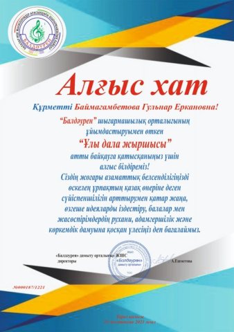Кроме того, за значительный вклад в развитие творческих способностей талантливой молодежи и за воспитание подрастающего поколения награждена медалью и дипломом «Ұлы дала жыршысы» в честь 175-летия Жамбыла Жабаева заместитель декана по воспитательной работе Казахского автомобильно-дорожного института имени Л.Б. Гончарова Баймагамбетова Г.Е.