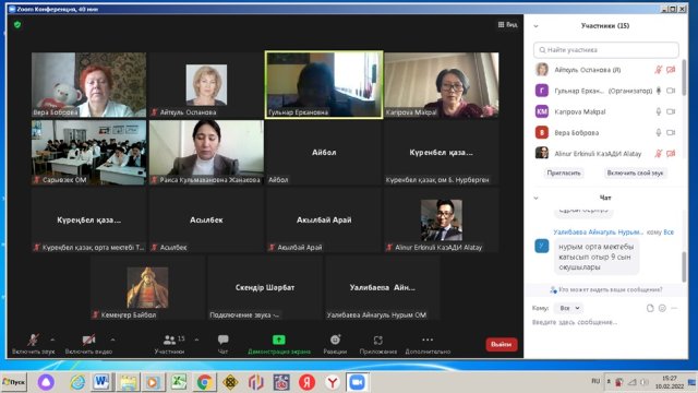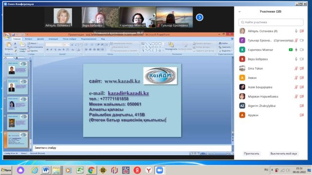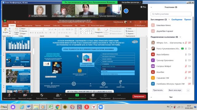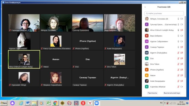 Также, в онлайн-встрече приняли участие преподаватели Карипова М. Р. и Боброва В. Н. из кафедры «Экономика». Оспанова А. А. из кафедры «ОД и ИС», Жанакова Р. К. из кафедры «ТС и ПСМ и К» и Сабралиев Н. С. из кафедры «ТТТ и Т и ОП».
