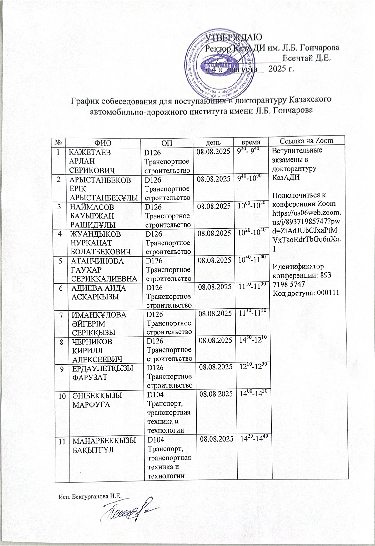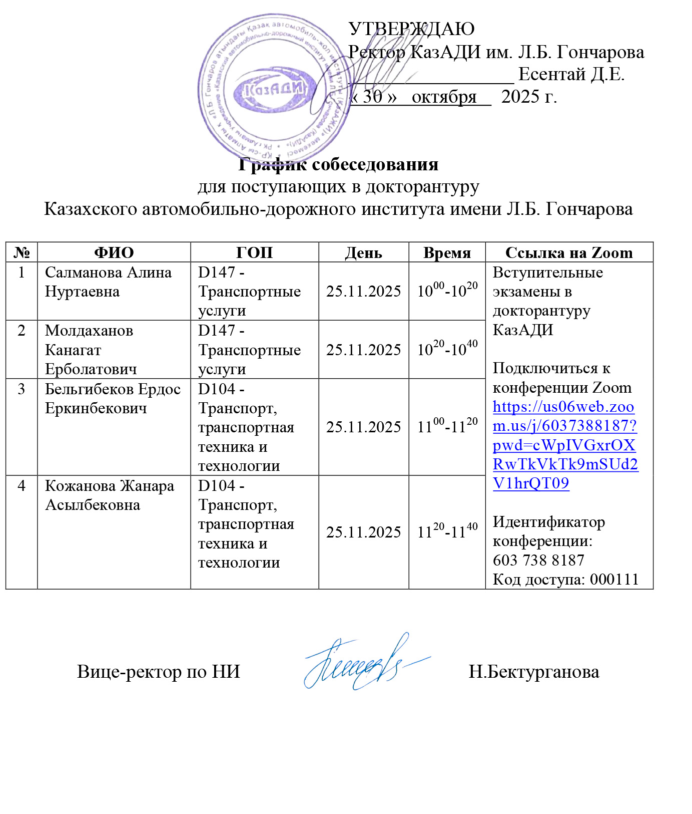 Абитуриенты, поступающие в докторантуру, регистрируются на сайте Национального центра тестирования (НЦТ) для сдачи вступительного экзамена по группам образовательных программ в региональных центрах тестирования с 3 июля по 3 августа и предоставляют в КазАДИ им. Л.Б.Гончарова следующие документы: