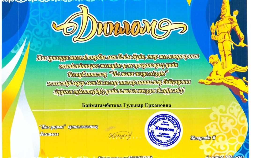 За вклад в воспитание и развитие подрастающего поколения заместитель декана по воспитательной работе Казахского автомобильно-дорожного института имени Л. Б. Гончарова Баймагамбетова Г. Е. награждена дипломом центра «Жас дарын».